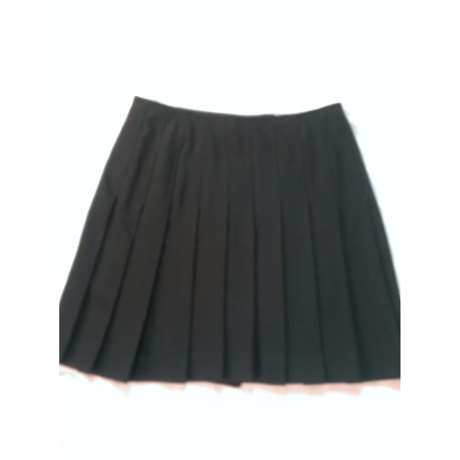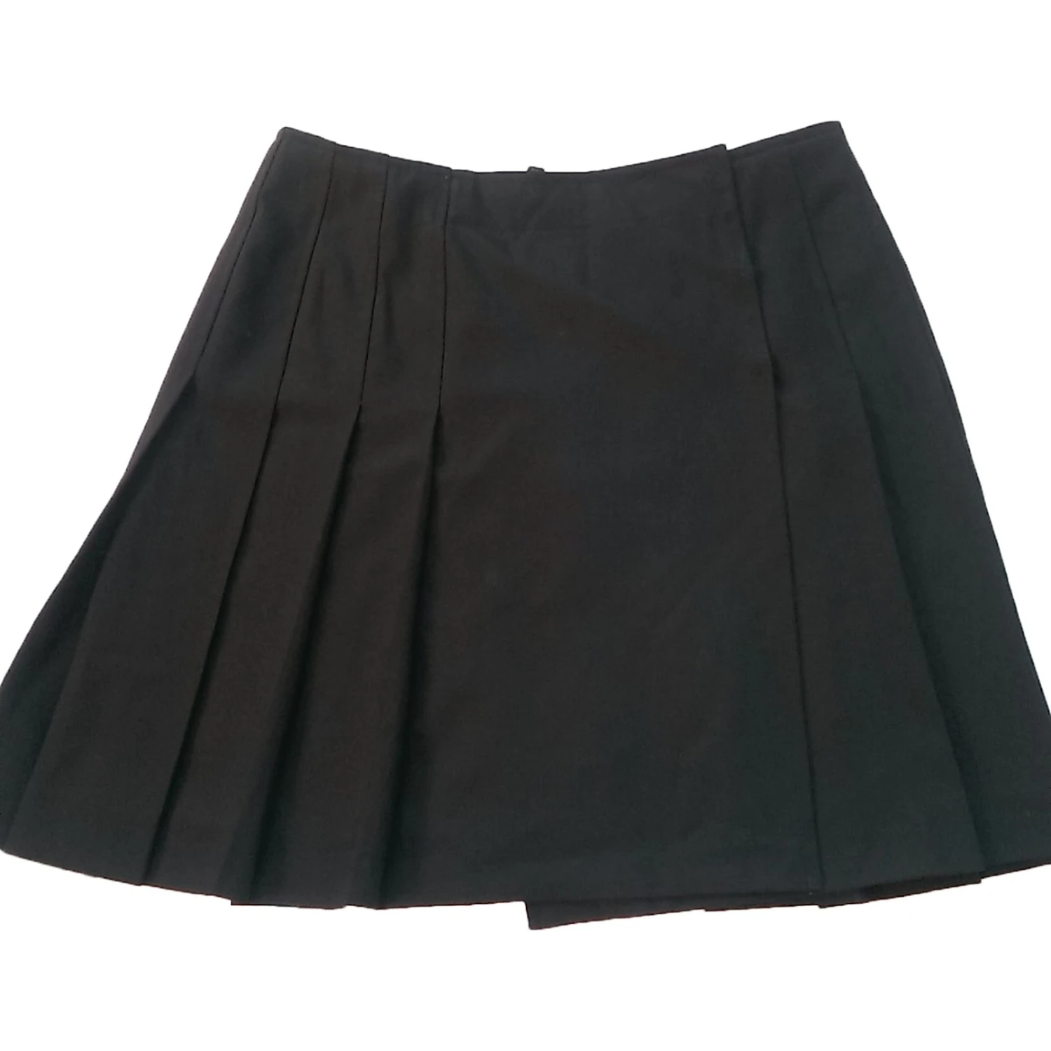 Jupe courte plissée, ouverte sur le devant, fermeture boutons à pression.